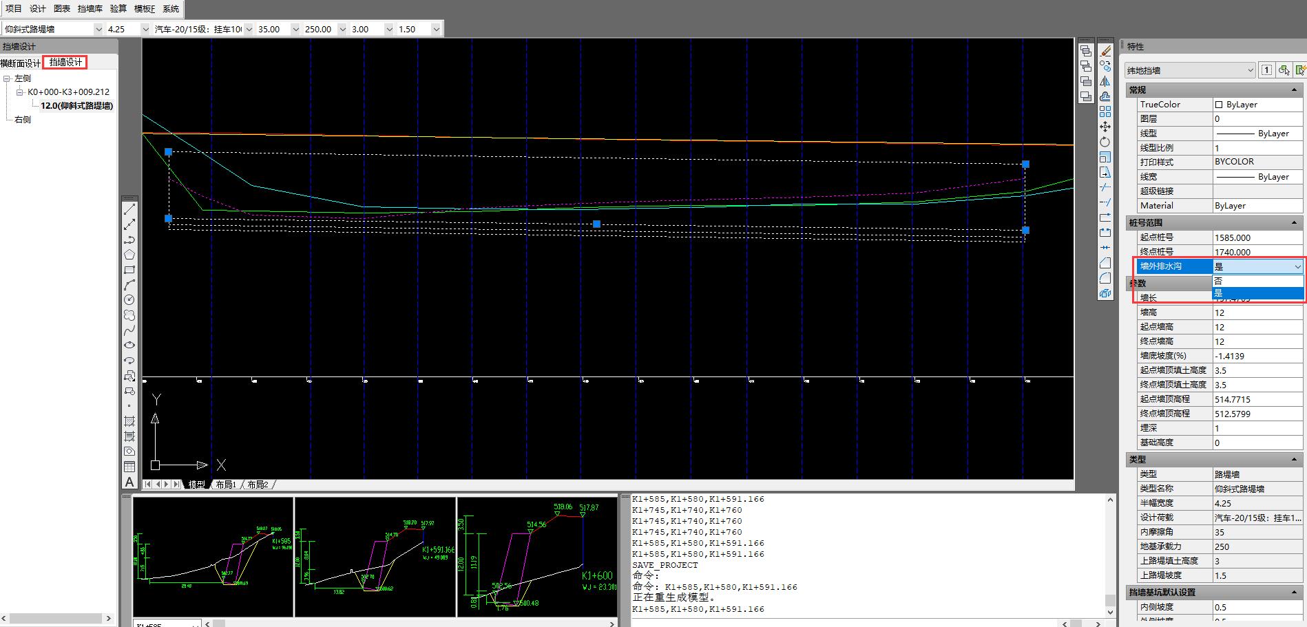 你好,布设完路堤墙后在特性栏中选择设置墙外排水沟就可以啦。如下图: