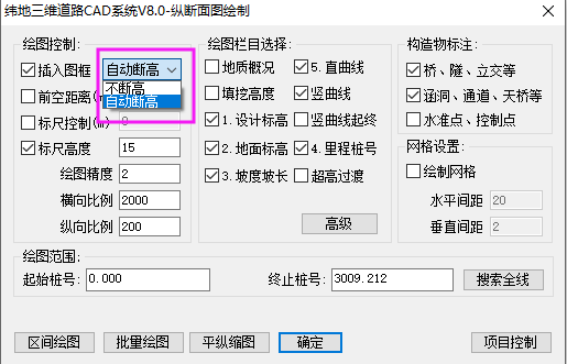 你好,您当前所选的断高方式为数据断高(该模式下纵断面绘图范围、断高位置均由数据文件控制),将纵断面断高形式改为不断或者自动断高就可以啦。